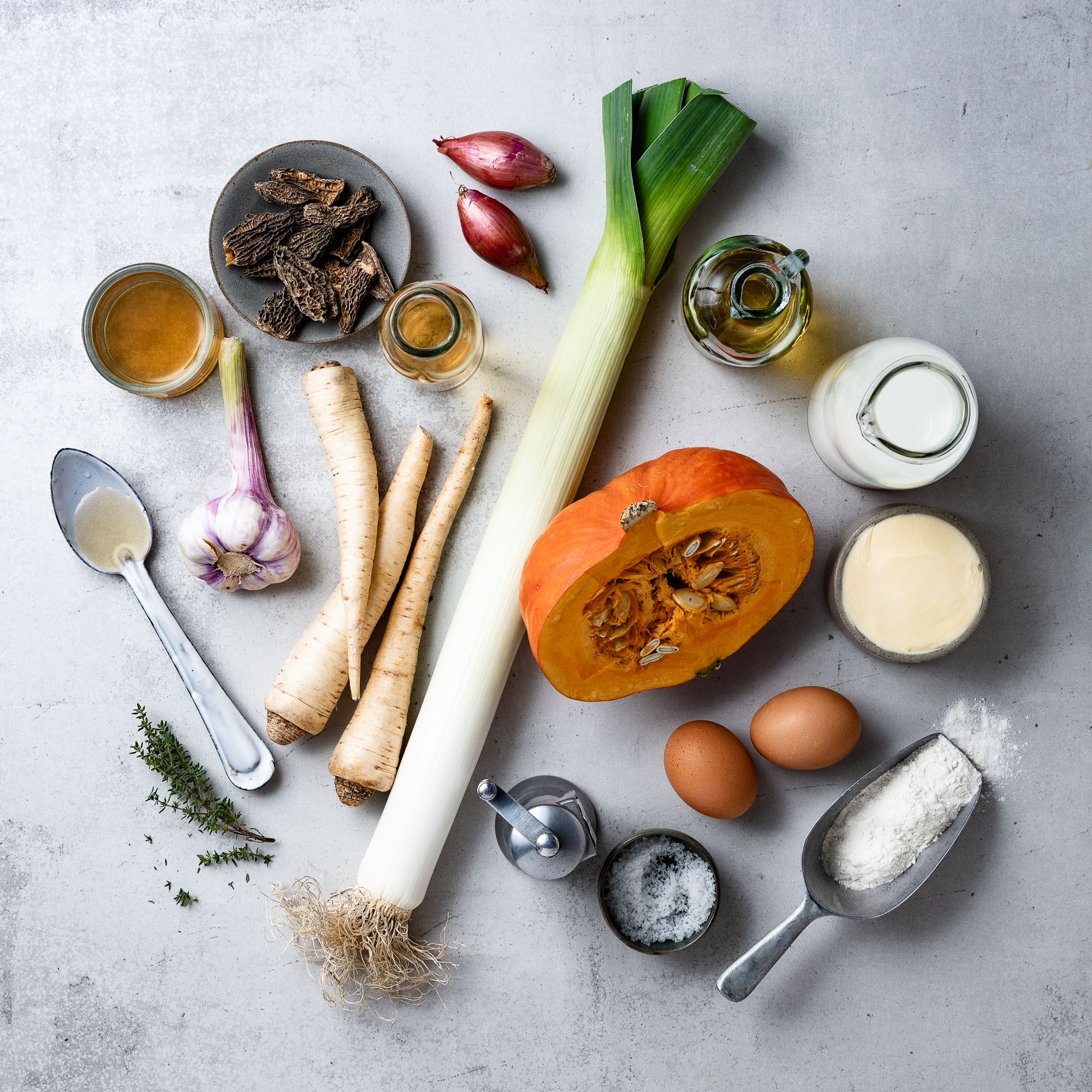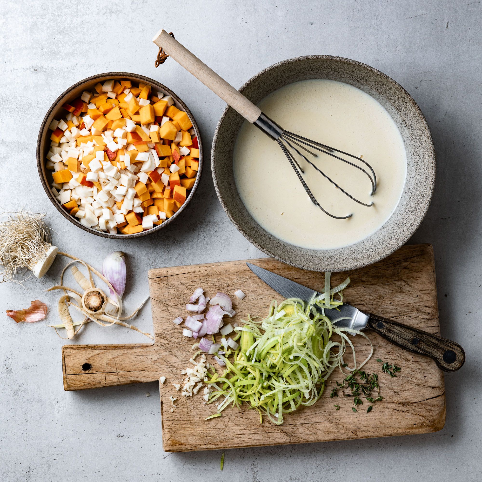 Für die Crêpes Mehl und 1 große Prise Fleur de sel in einer Schüssel vermischen. Die Eier und nach und nach die Milch unterrühren, bis ein glatter Teig entstanden ist. Abgedeckt 30 Minuten ruhen lassen. Inzwischen für die Füllung die Schalotte und den Knoblauch schälen und fein würfeln. Die Petersilienwurzeln schälen, Kürbis waschen und entkernen, beides in feine Würfel schneiden. Den Lauch putzen, waschen und in dünne Ringe schneiden.