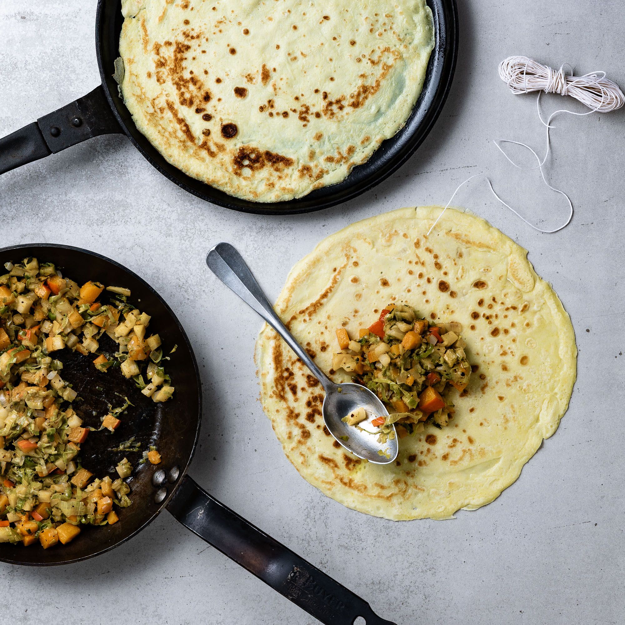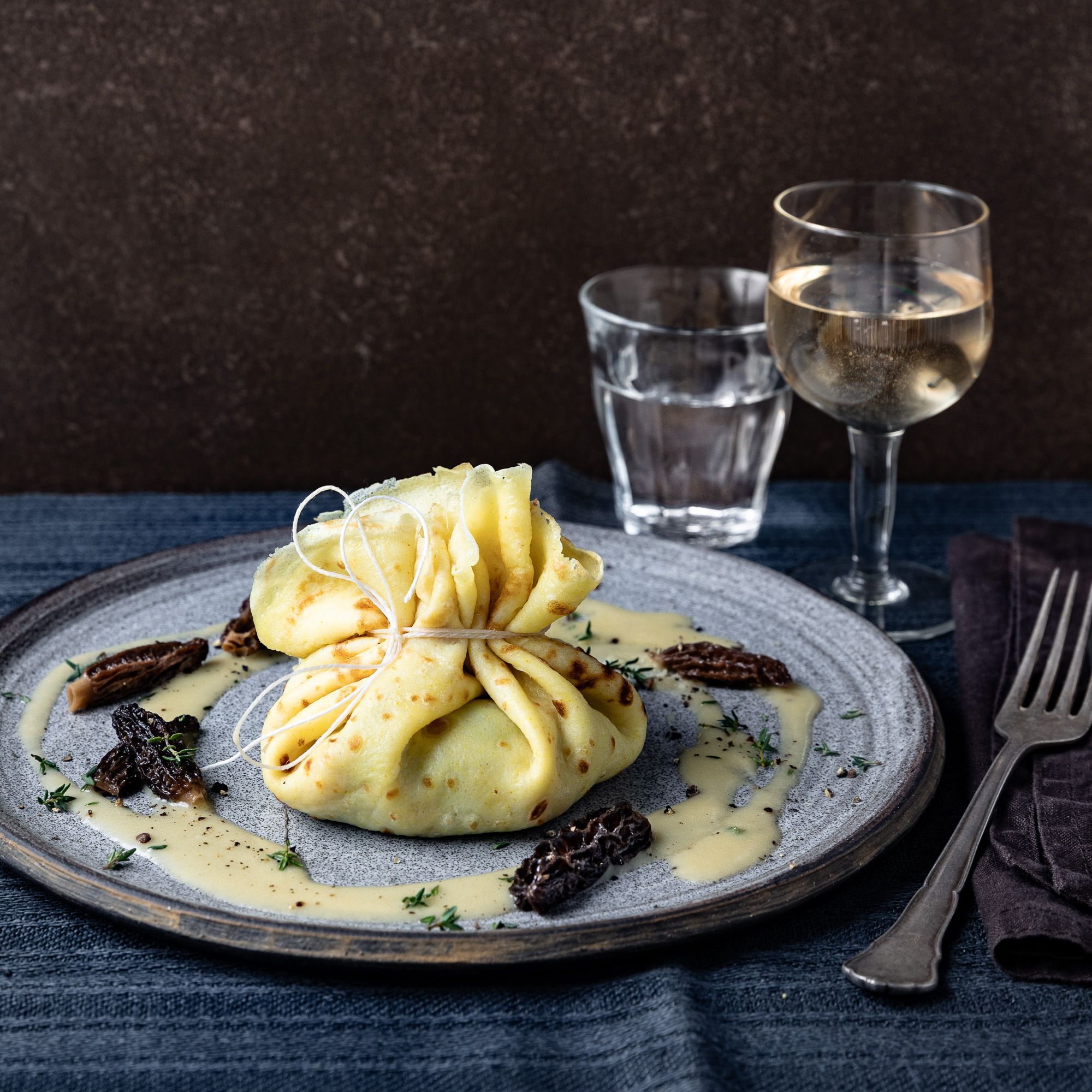 Voilà, so festlich kann ein Gericht auch ohne Fisch und Fleisch sein: Aromatische Gemüsefüllung, zarte Crêpehülle, buttrige Weißweinsauce und als besonderes i-Tüpfelchen feine französische Morcheln.