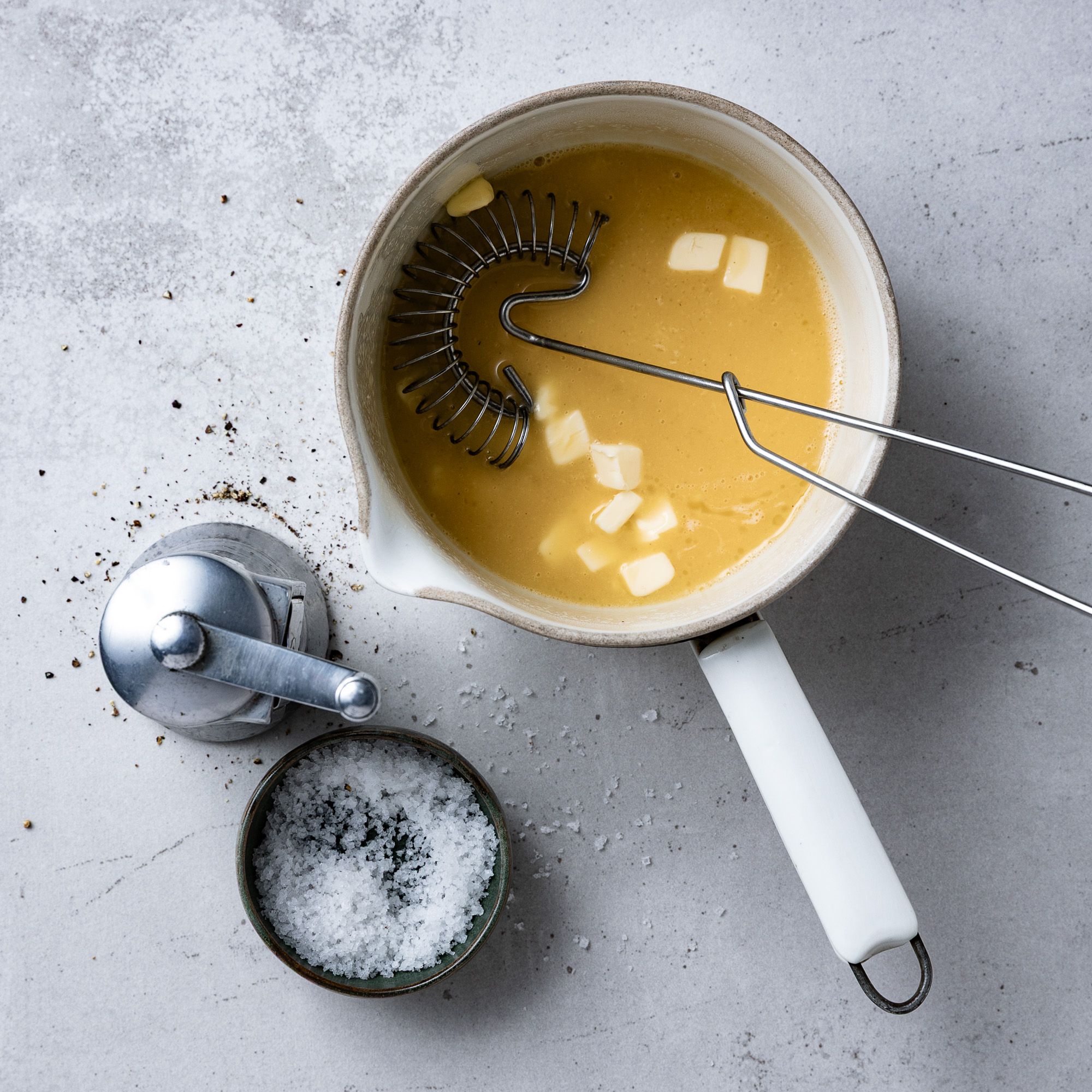 Für die Sauce die Butter bis auf 1 EL in kleine Würfel schneiden und für ca. 20 Minuten tiefkühlen. Inzwischen die Schalotte schälen und ganz fein würfeln. In einem kleinen Topf 1 EL Butter aufschäumen lassen und die Schalottenwürfel darin glasig andünsten. Weißwein und Essig dazugießen, aufkochen und die Flüssigkeit bei großer Hitze fast komplett verkochen lassen. Durch ein feines Sieb in einen zweiten kleinen Topf passieren, dabei die Rückstände im Sieb gut ausdrücken. Den Weinsud (etwa 2-3 EL) einmal aufkochen lassen, dann die Hitze reduzieren und die kalten Butterwürfelchen nach und nach mit einem Saucenschneebesen unter die Flüssigkeit rühren, dabei die Sauce nicht kochen lassen. Die Sauce mit Salz und Pfeffer abschmecken und den Topf vom Herd nehmen, warmhalten.