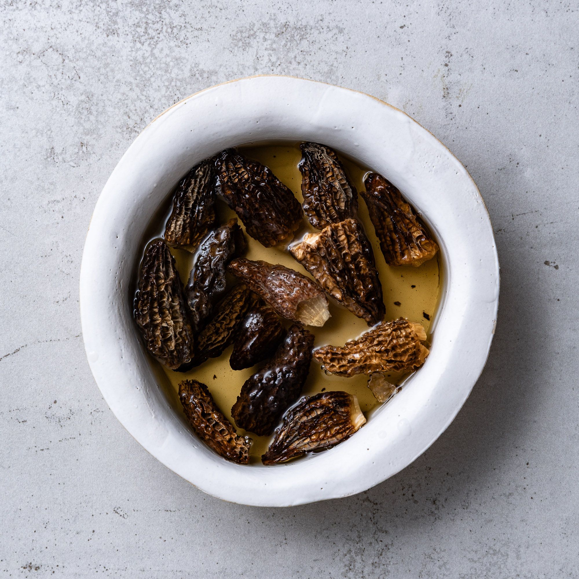 Die getrockneten Morcheln mit 100 ml kochendem Wasser übergießen und 10 Minuten einweichen lassen.