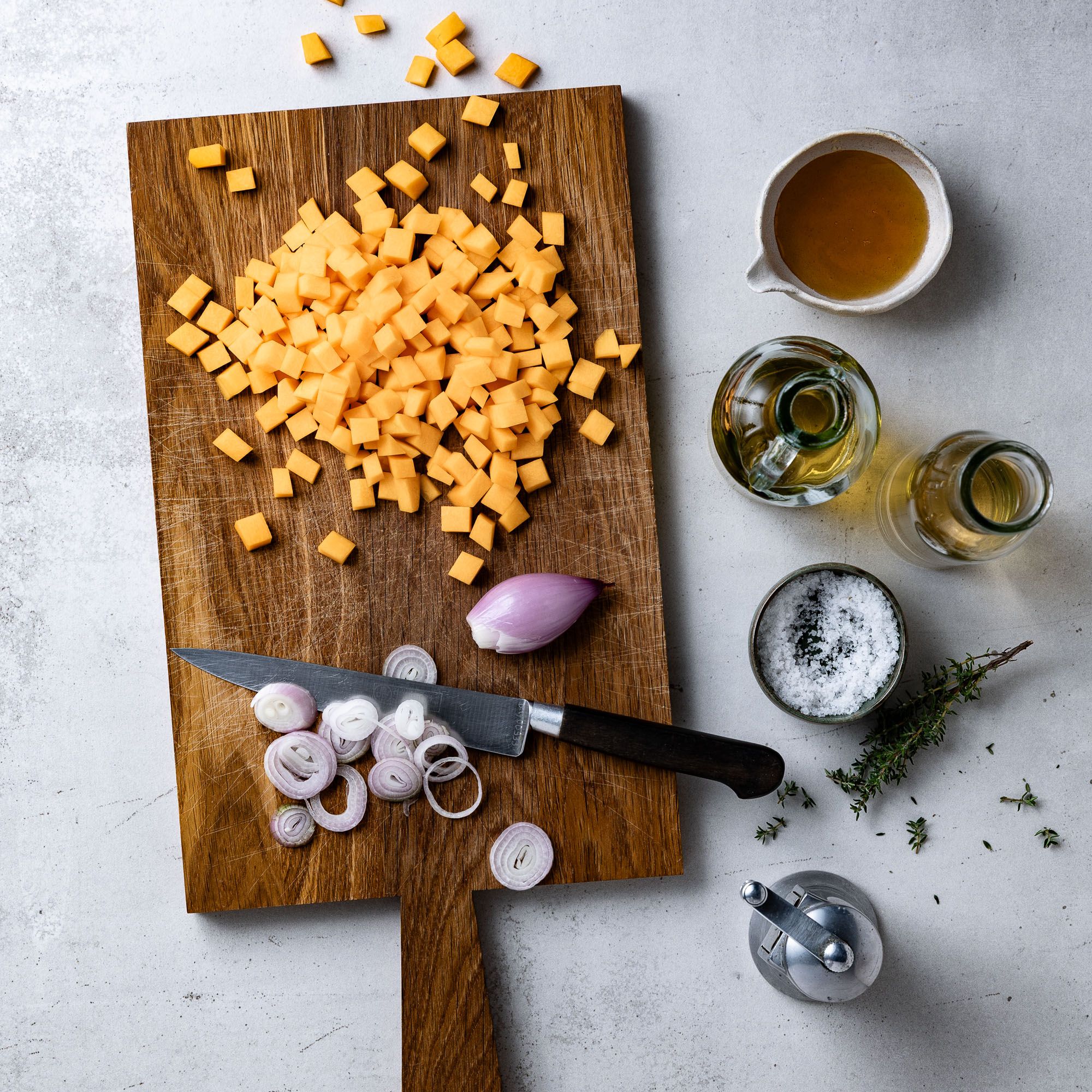 Den Kürbis schälen, das weiche, faserige Innere entfernen und das Fruchtfleisch in knapp 1 cm große Würfel schneiden. Die Schalotten schälen und in Ringe schneiden.