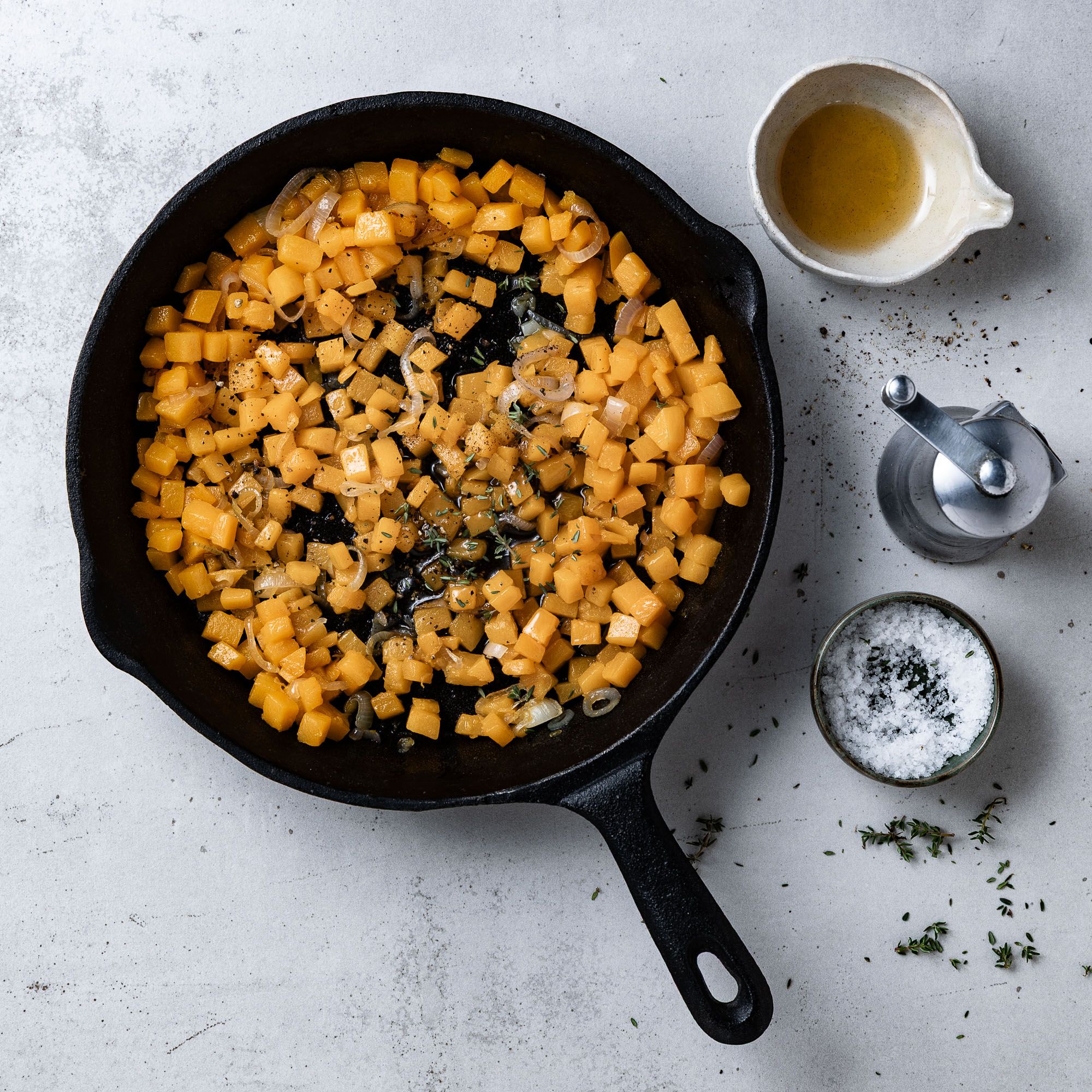 In einer weiten Pfanne das Olivenöl erhitzen, Kürbis und Schalotten ca. 5 Minuten andünsten, bis beides weich ist.