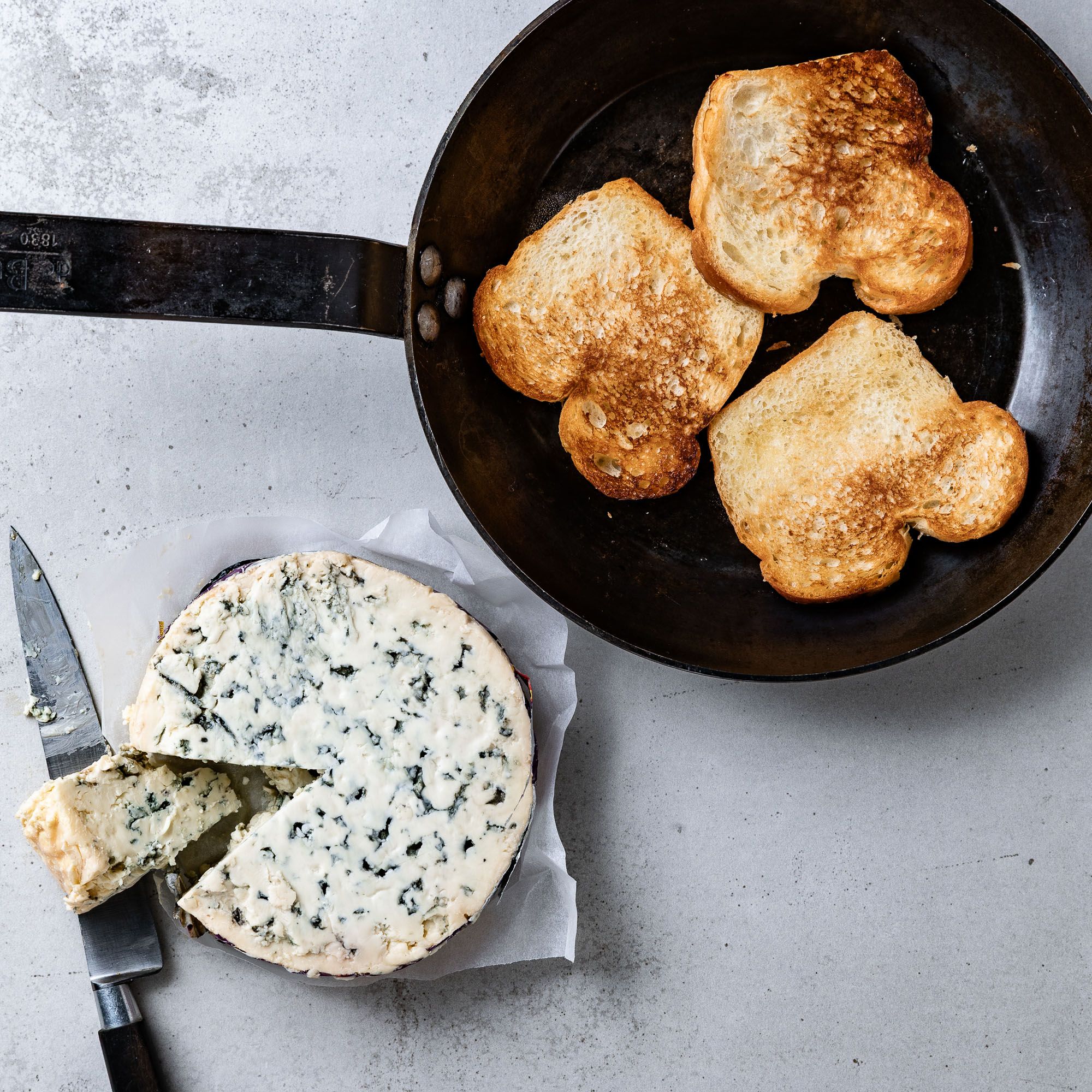 Fourme d‘Ambert in kleine Stückchen bröckeln. Die Briochescheiben in einer Pfanne in der Butter von beiden Seiten goldbraun rösten und herausnehmen.