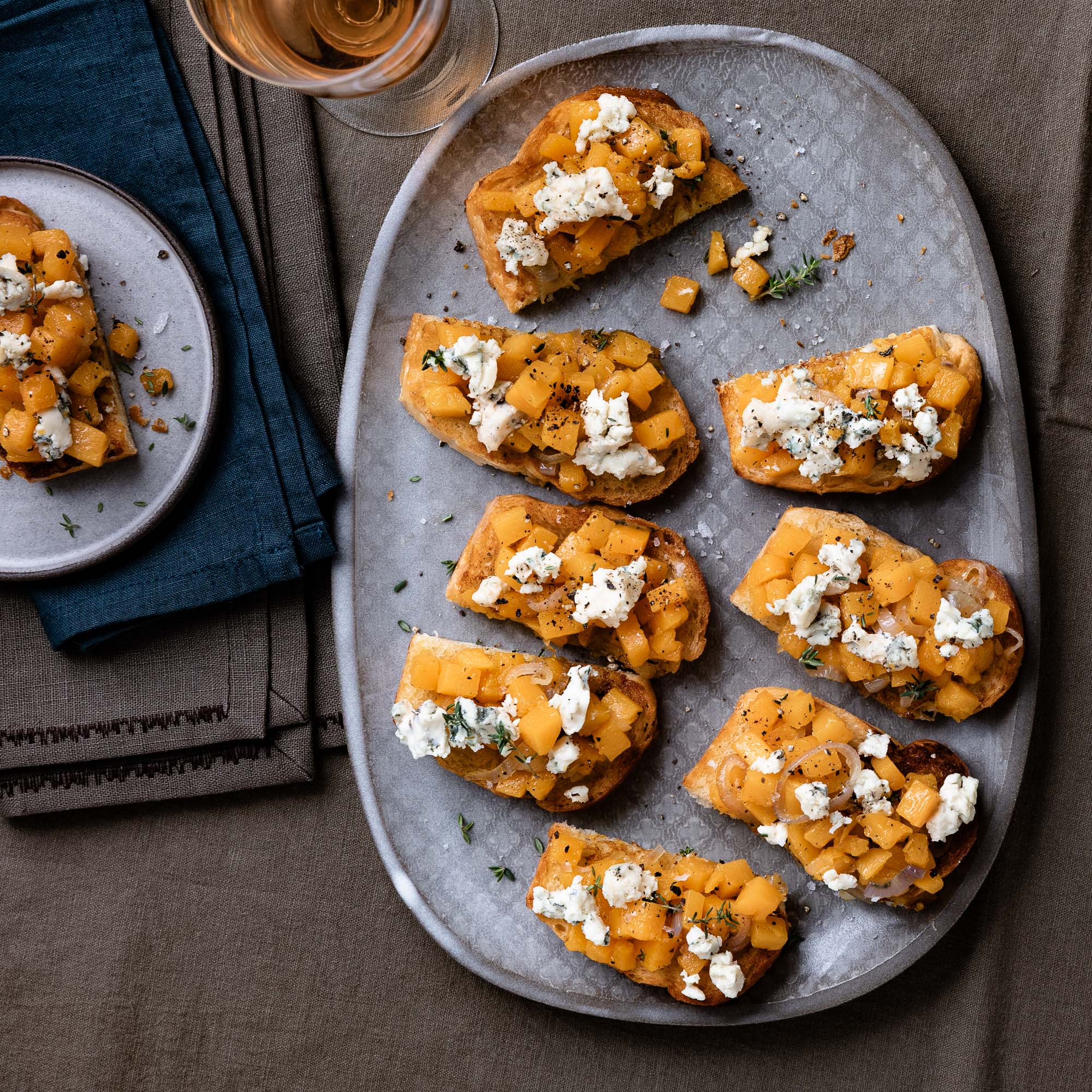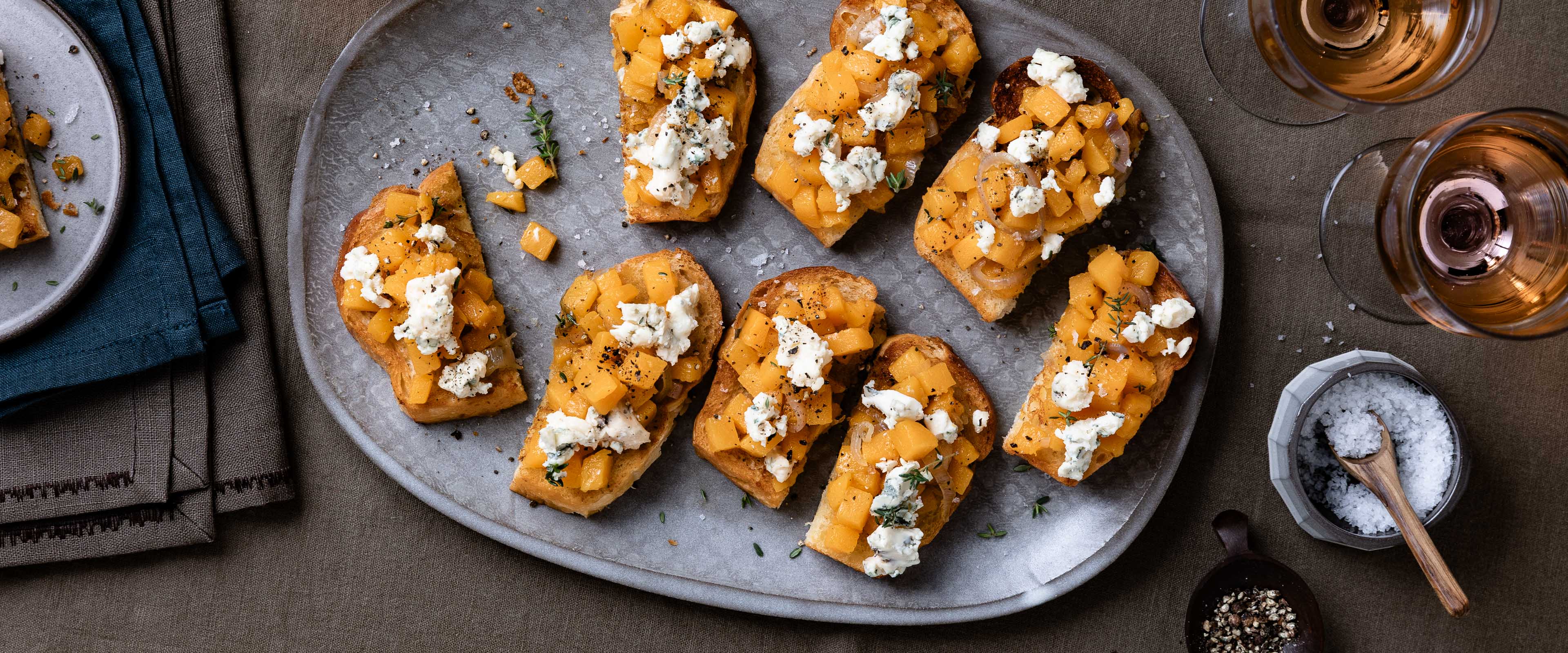 Buttrige Briochescheiben, karamellisierter Butternutkürbis und würziger Edelschimmelkäse aus der Auvergne sind ein köstliches Trio. In kleine Häppchen geschnitten schmecken die Toasts wunderbar zum Aperitif.