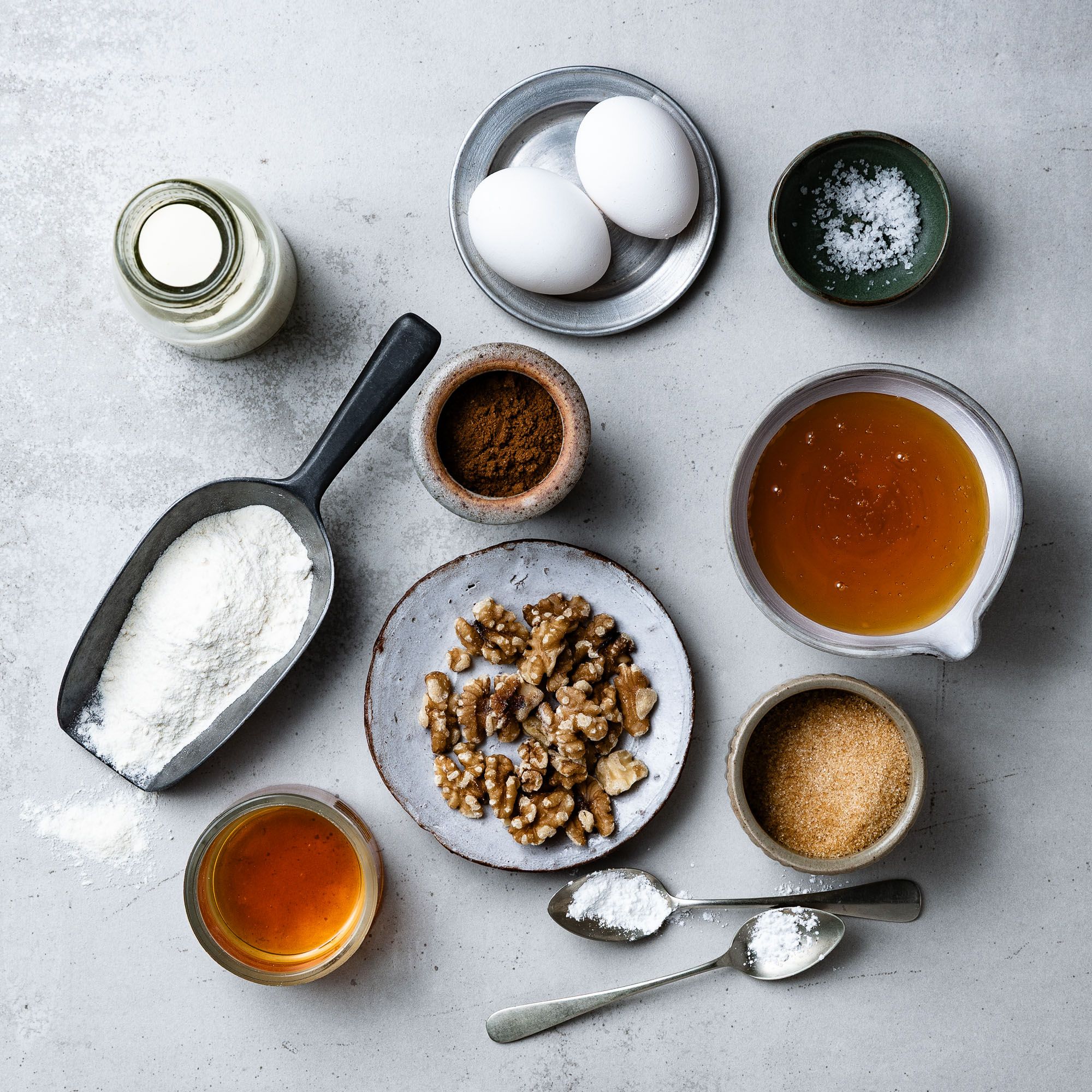Die Walnüsse gleichmäßig hacken. Mehl mit Backpulver, Natron, Lebkuchengewürz und Fleur de sel in einer Schüssel mischen. Die gehackten Walnüsse untermischen.