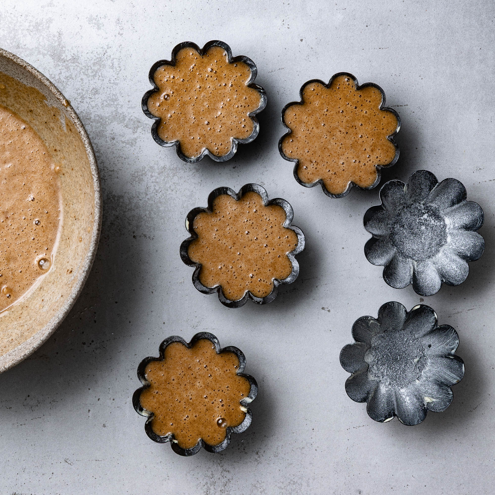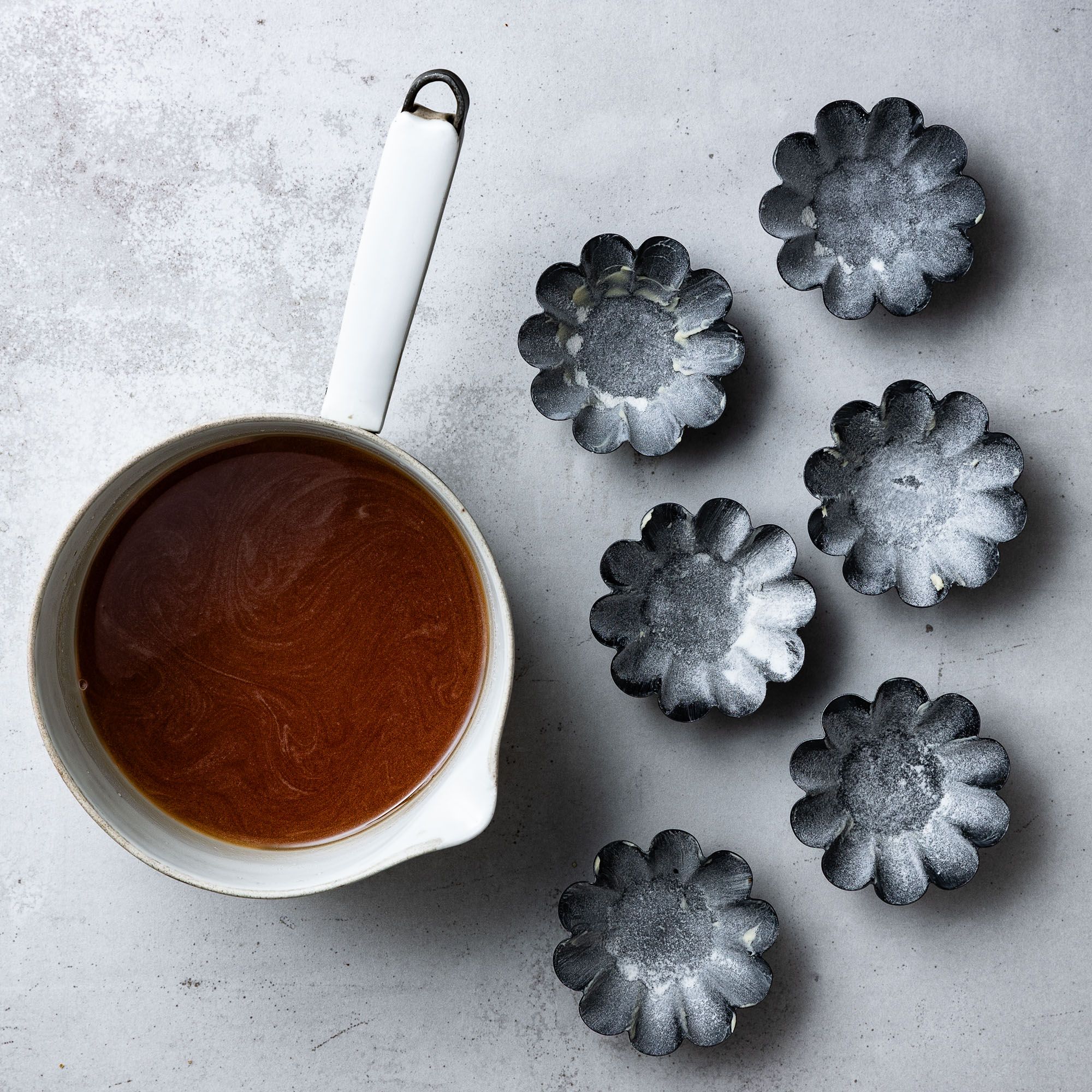 Die Förmchen einfetten, mit Mehl ausstreuen, überschüssiges Mehl ausschütteln. Den Backofen auf 180 °C Ober-/Unterhitze oder 160 °C Umluft vorheizen. Für den Teig Tannenhonig, Rohrzucker und 160 ml Wasser in einem Topf aufkochen. Sobald es kocht, den Topf vom Herd nehmen.