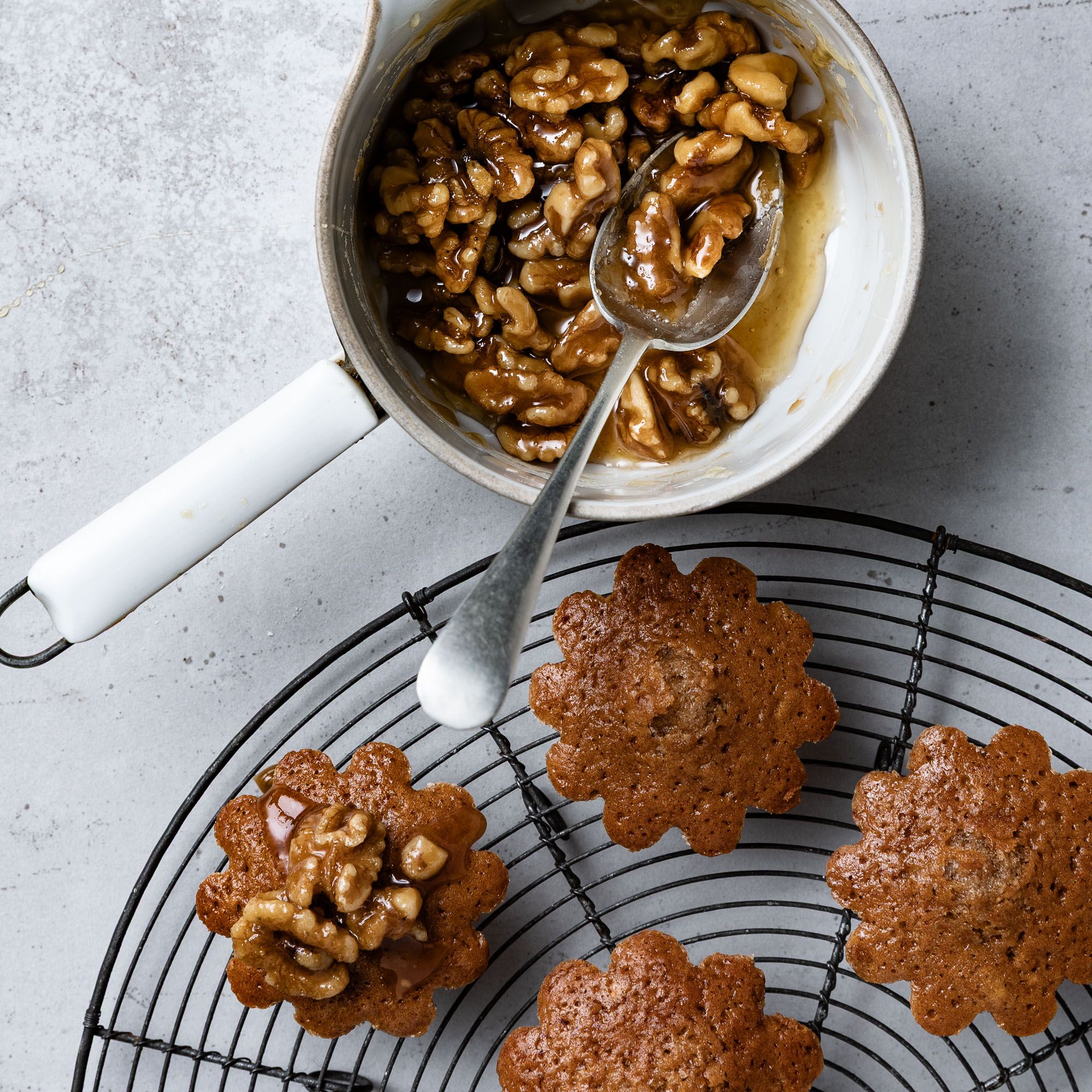 Für die Karamell-Nüsse den Zucker und 3 EL Wasser in einem kleinen Topf zu hellbraunem Karamell schmelzen lassen. Die Walnüsse unterrühren und kurz weiter erhitzen, bis sie vom Karamell überzogen sind, dann auf die Küchlein geben und abkühlen lassen.
