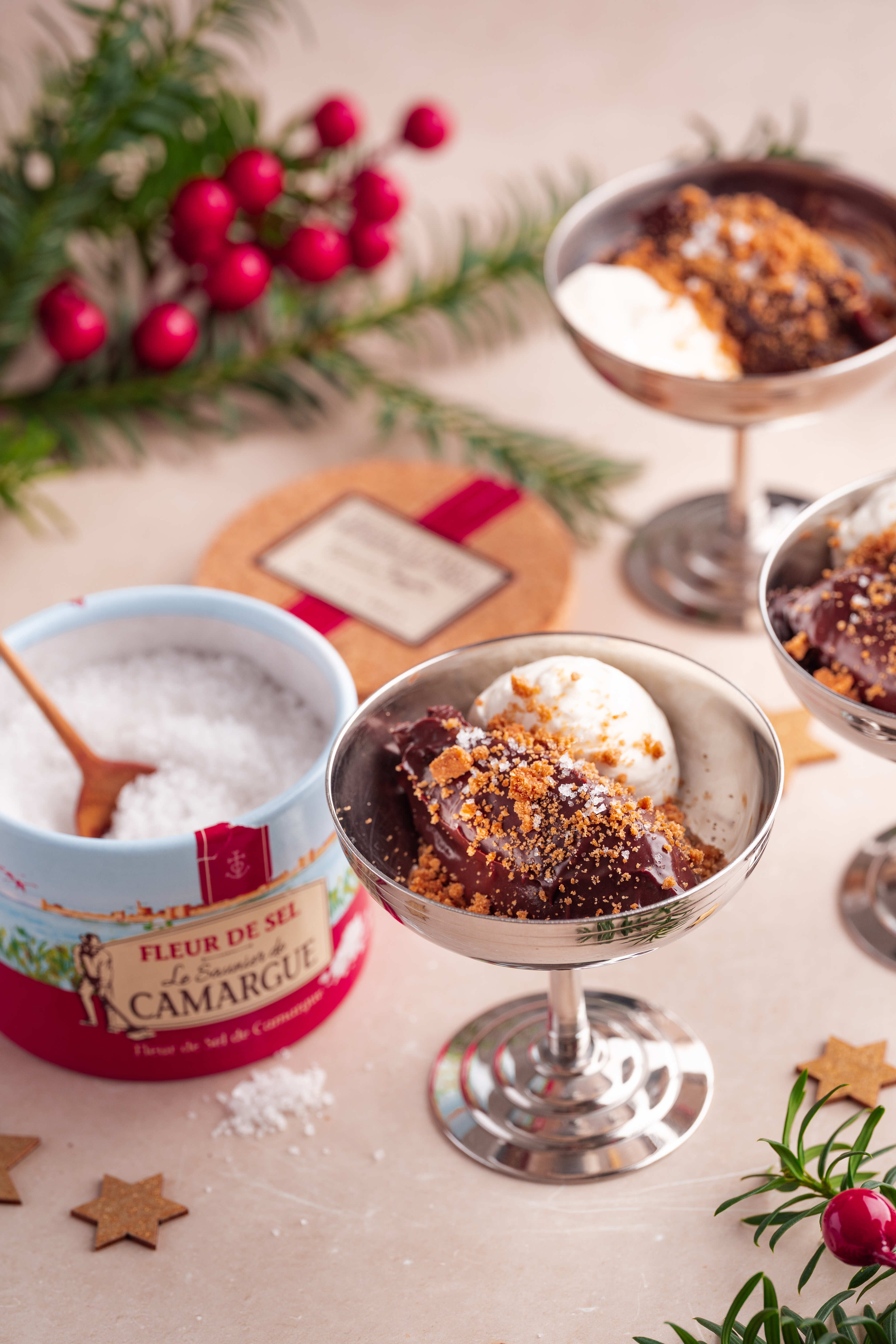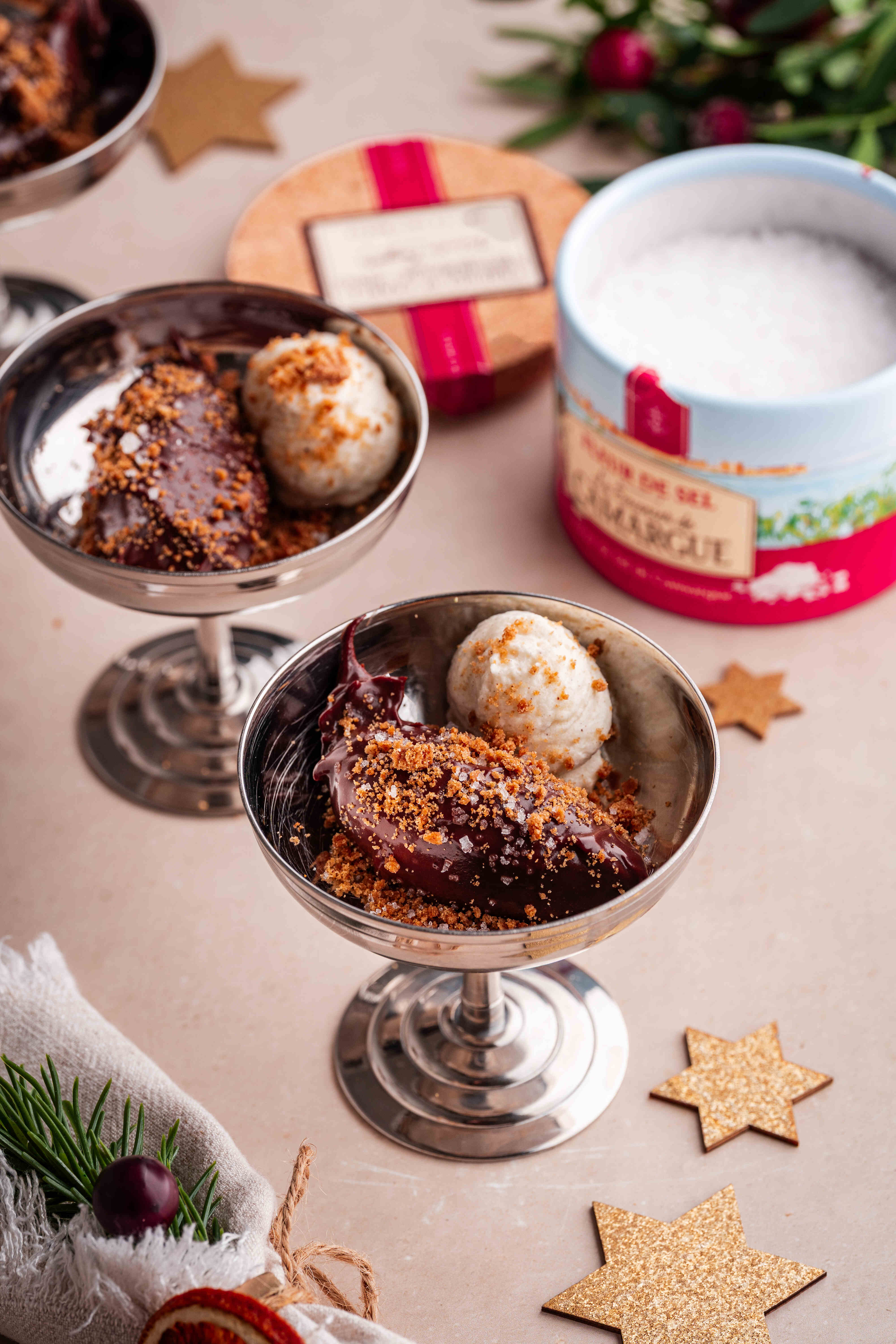 Eine Idee für ein festliches, köstliches Dessert: eine Schokoladenganache mit einer Prise Fleur de Sel. Einfach im Voraus zuzubereiten, wird dieses Dessert mit hausgemachter Schlagsahne und etwas zerbröselten Spekulatius verfeinert, die für einen leichten Crunch sorgen. Eine Prise Fleur de Sel rundet das Ganze perfekt ab und balanciert die süße Schokolade.