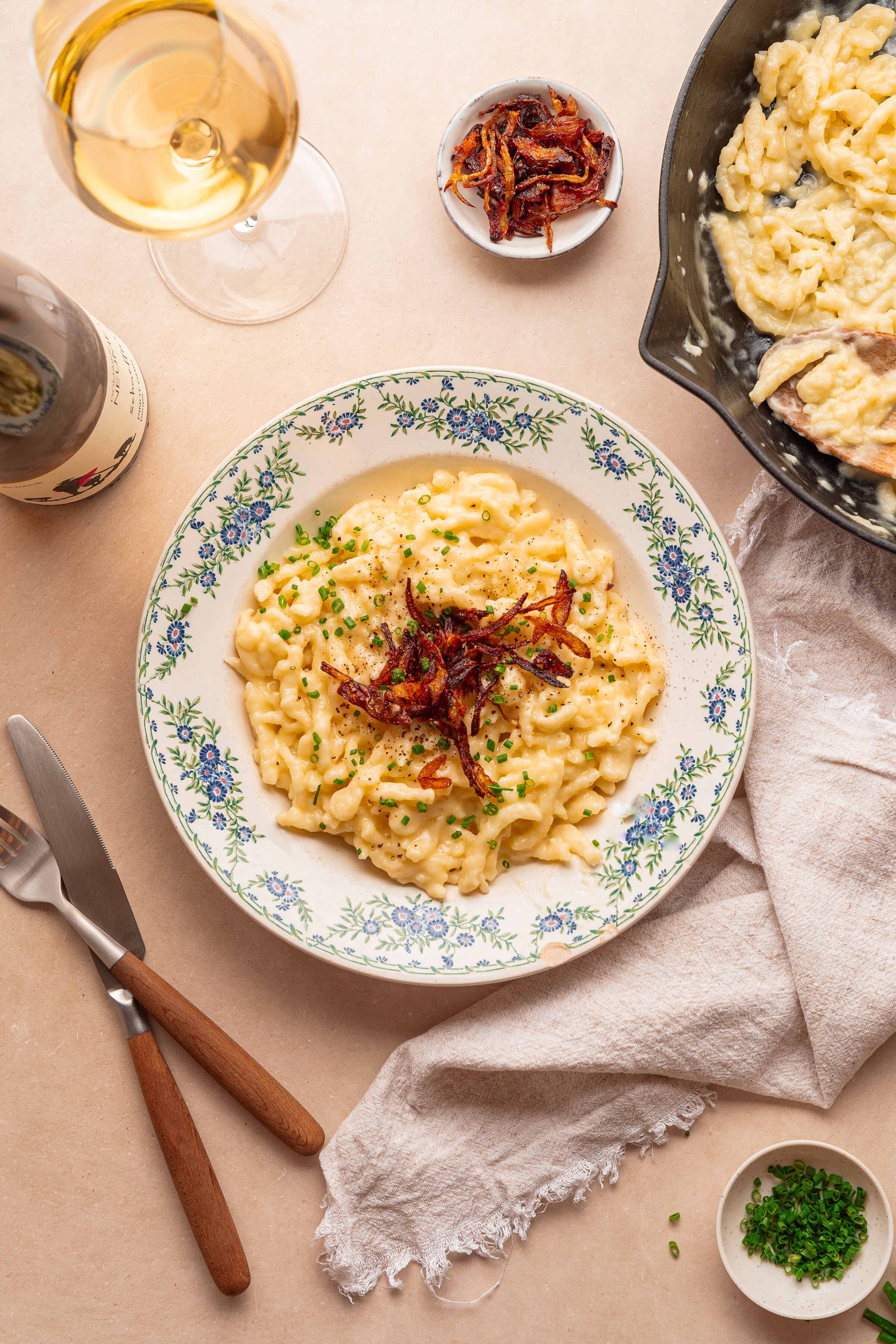 Käsespätzle gehören zu den großen Klassikern der elsässischen Küche. Herzhaft und voller Geschmack passen sie hervorragend zu einem Elsässer Weißwein, zum Beispiel einem Pinot Gris.