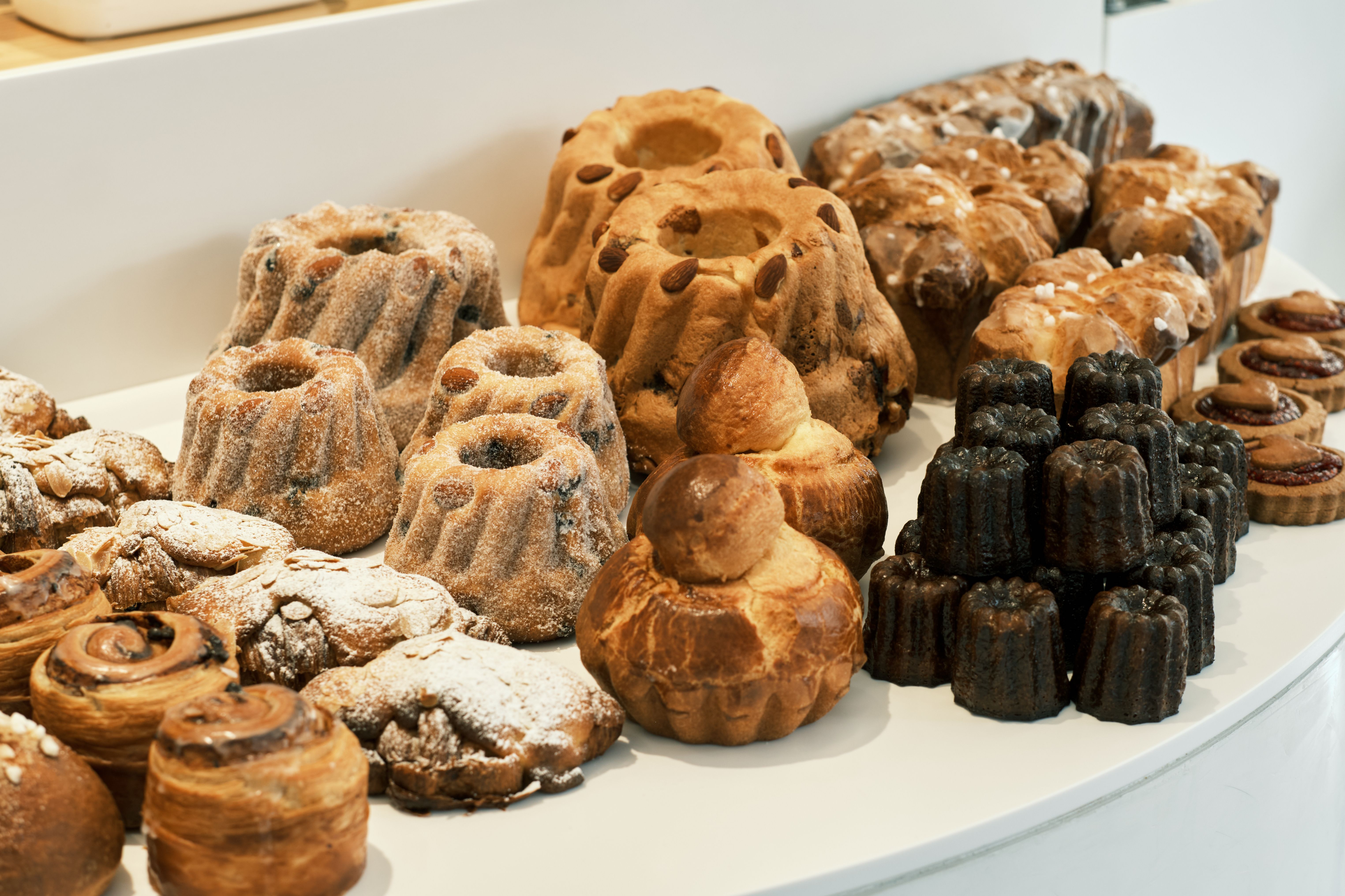 学芸大学の駅から大通りをまっすぐ歩いて約5分。淡いスモーキーグレーのスタイリッシュな外観と、お菓子の焼ける香ばしい匂いに誘われて、吸い込まれるように扉を開けると、目の前にはずらりと並ぶたくさんのヴィエノワズリー。クグロフ、ブリオッシュ、カヌレ、クイニーアマンなど、フランス各地の代表的な郷土菓子が勢ぞろいしており、心踊らずにはいられません。そして隣にはガラスのショーケースの中にまばゆいばかりの美しくおいしそうなケーキがお行儀よく並び、思わず笑みがこぼれ、ワクワクした気分が高まります。オープンと同時に途絶えることなく続々とお客さんが訪れ、店内はいつも賑やかです。