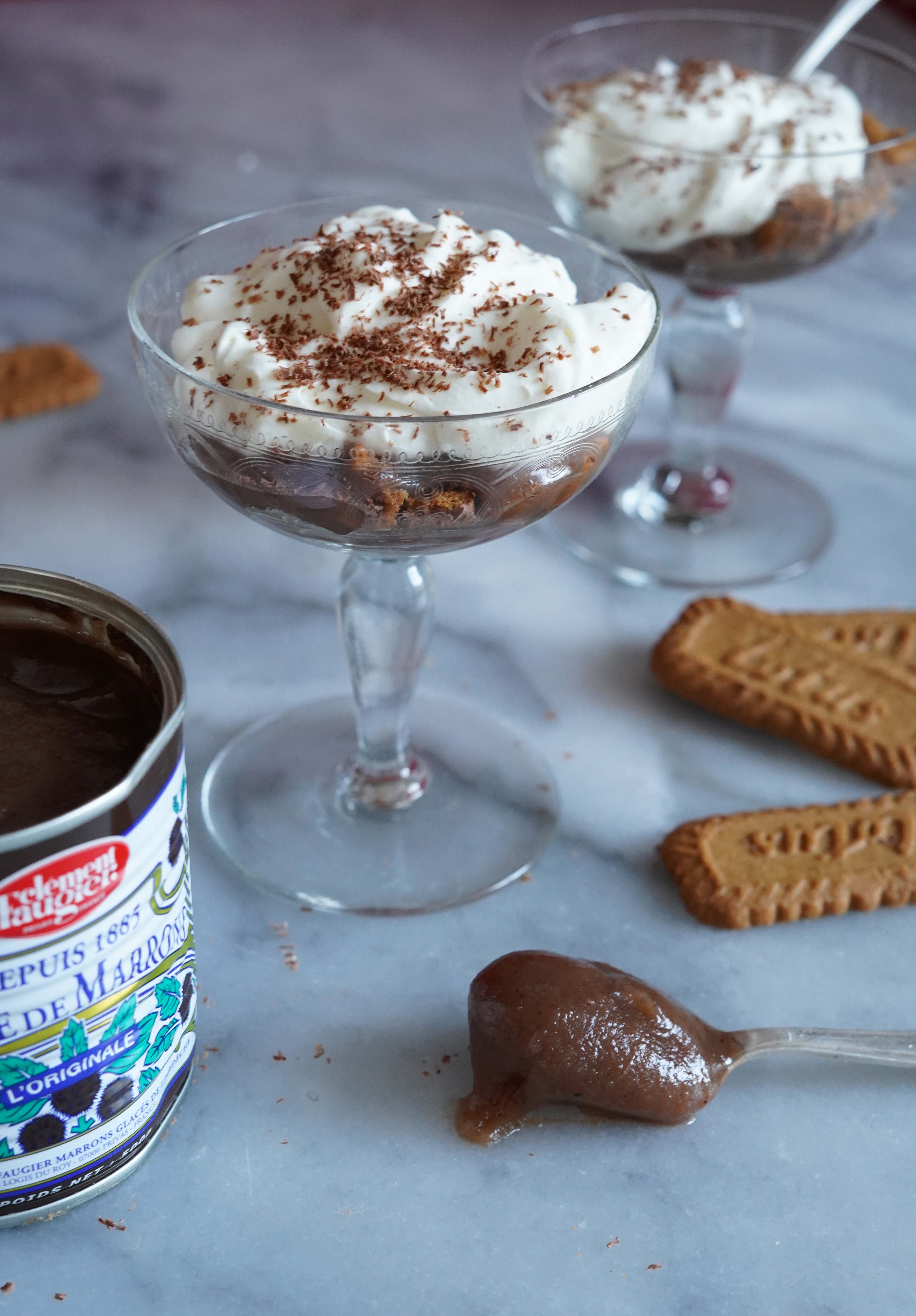 This is so easy to put together and wow is it delicious! Layers of crushed cookies (I love a spiced cookie like Biscoff), chestnut cream, and a large dollop of whipped cream. Spoon into a pretty glass, and you’re set! Finish it with a sprinkle of more cookie crumbs or shaved chocolate.