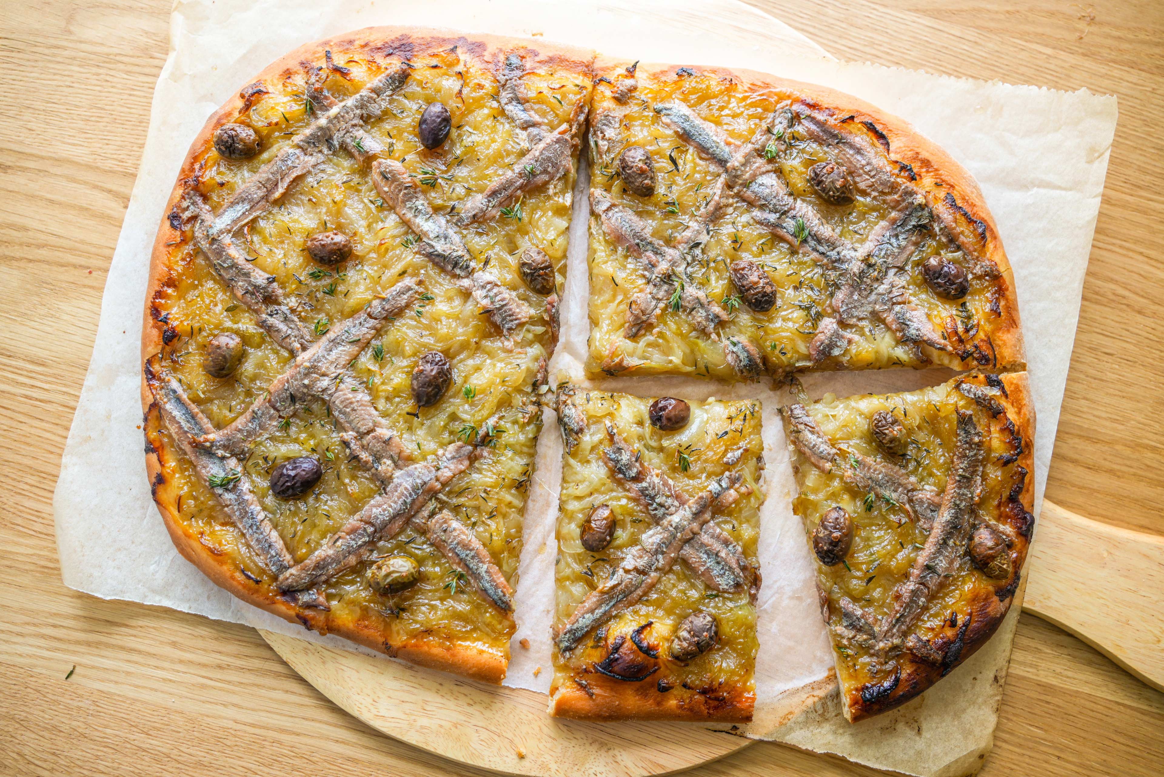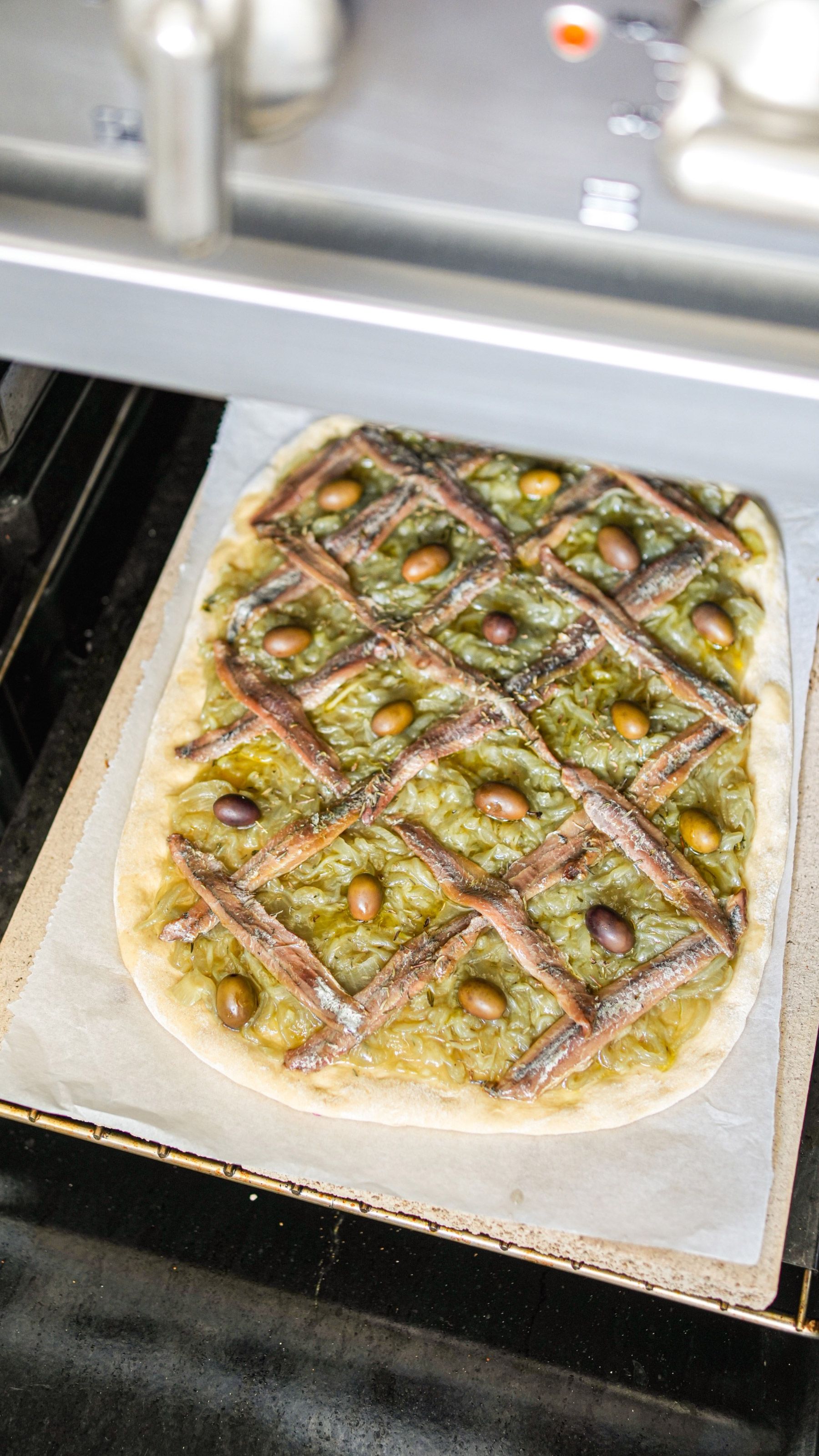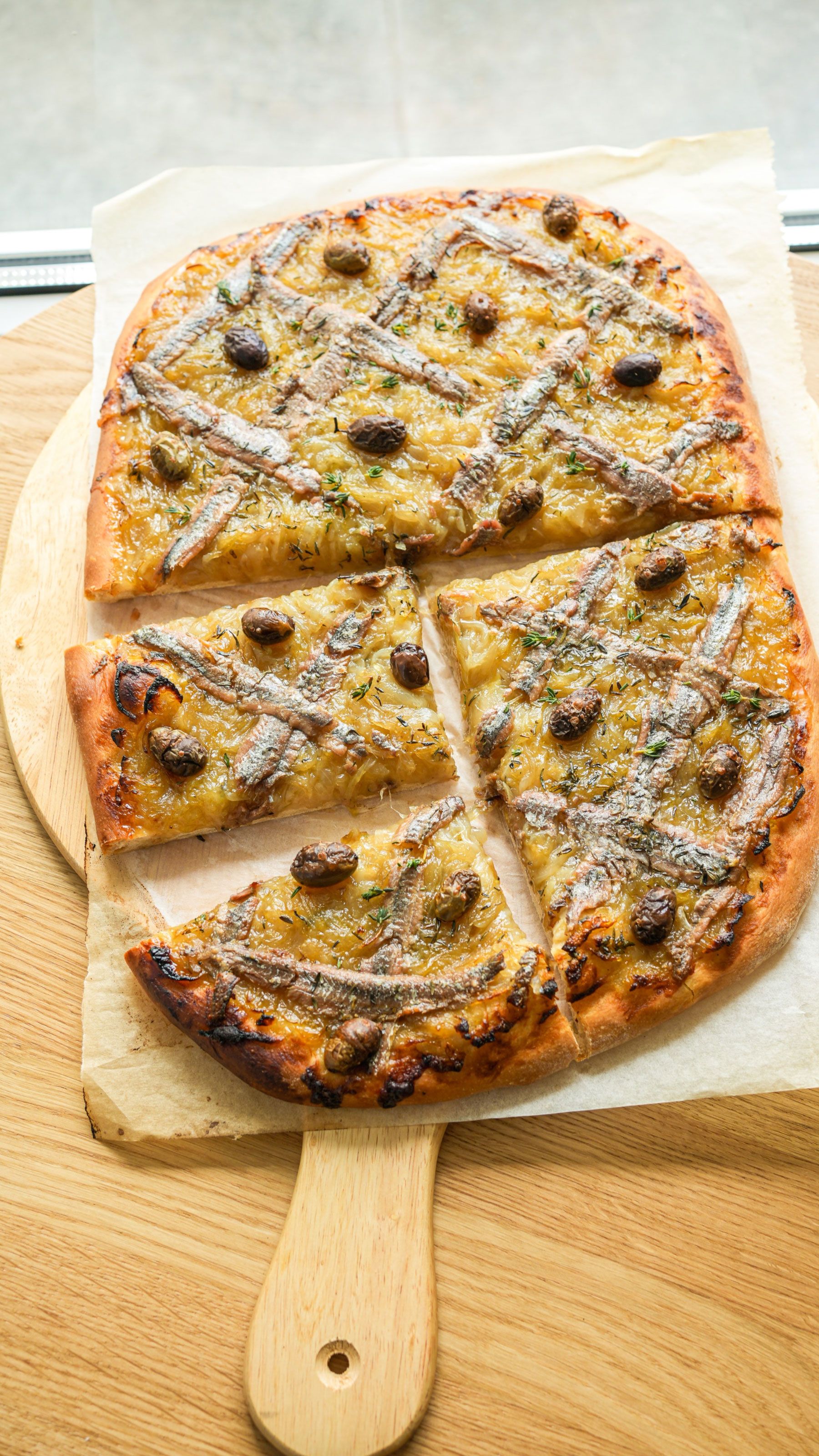 Pissaladière is one of the great specialities of Nice and the French Riviera, alongside other iconic dishes from the South of France such as Salade Niçoise, Ratatouille and Tapenade. Its name comes from the old Niçois word pissalat (peis salat, meaning “salted fish”), which was a paste made from anchovies and sardines marinated in salt and herbs. Traditionally, this intensely savoury mixture was spread over the dough before the onions, giving the tart its distinctive Mediterranean identity. Today, whole anchovy fillets are more commonly used, but the spirit of the dish remains the same: simple ingredients transformed into something deeply flavourful.