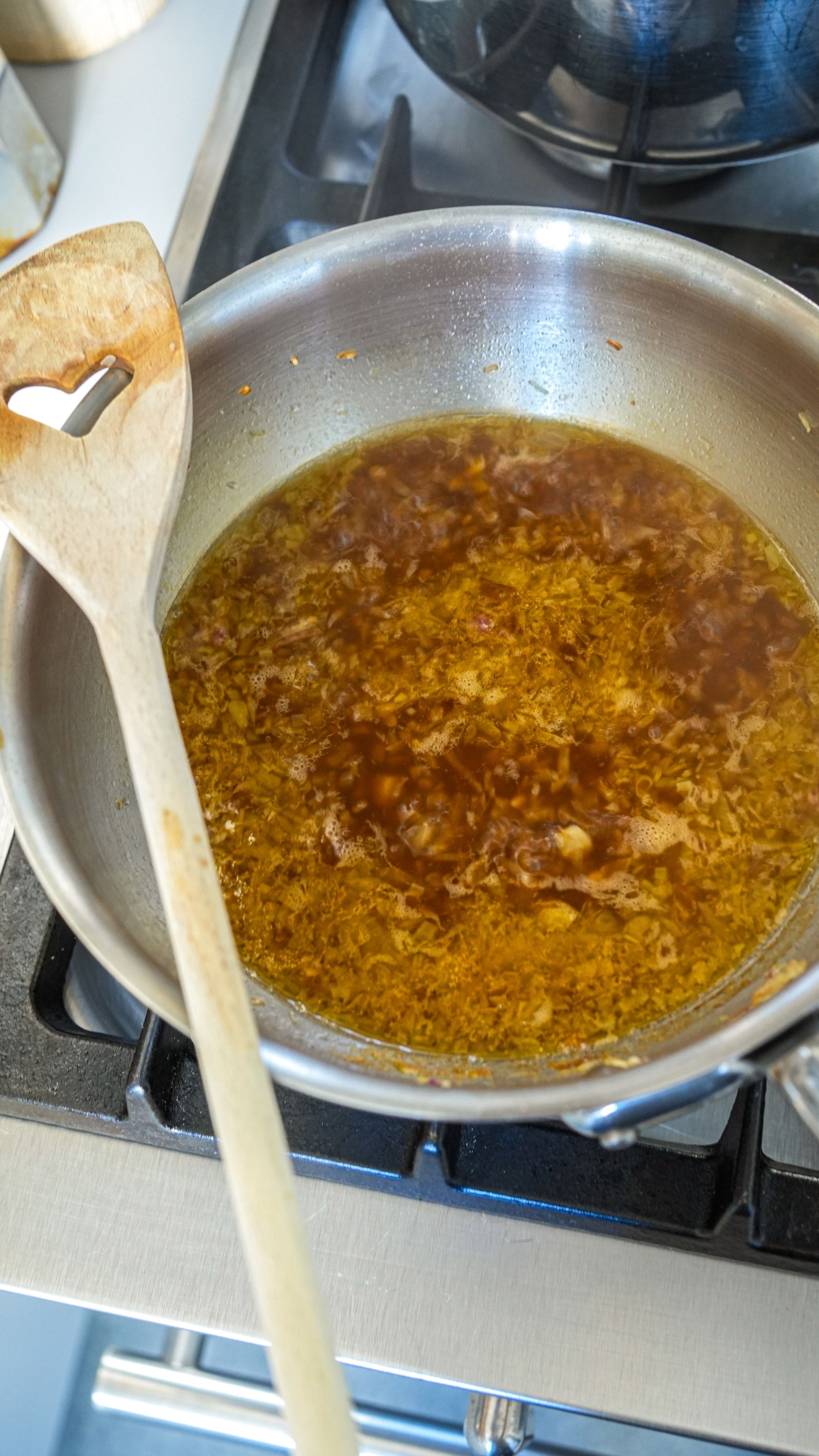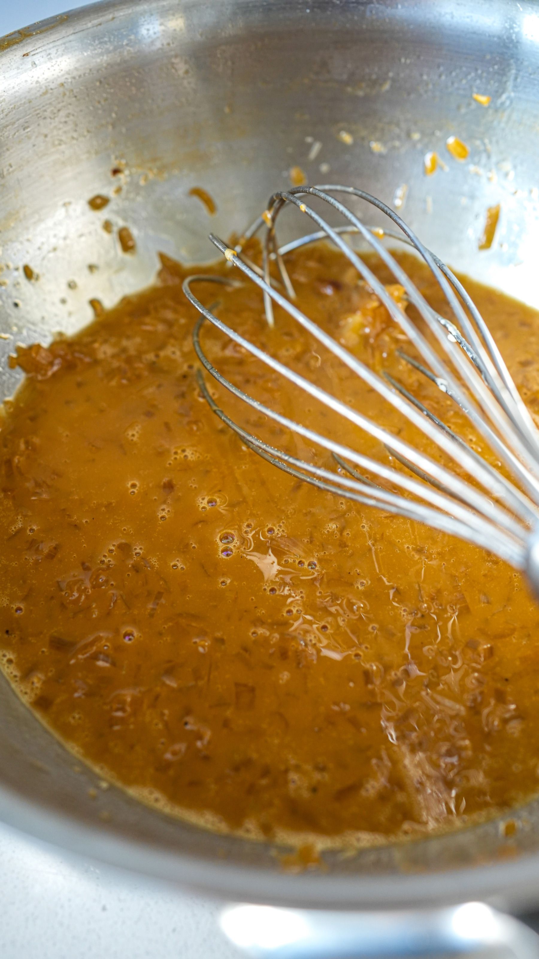 Then, finish the butter sauce. Ensure the shallot reduction is hot. Remove from the heat and whisk in the remaining 15 g of butter to create a glossy, velvety sauce.