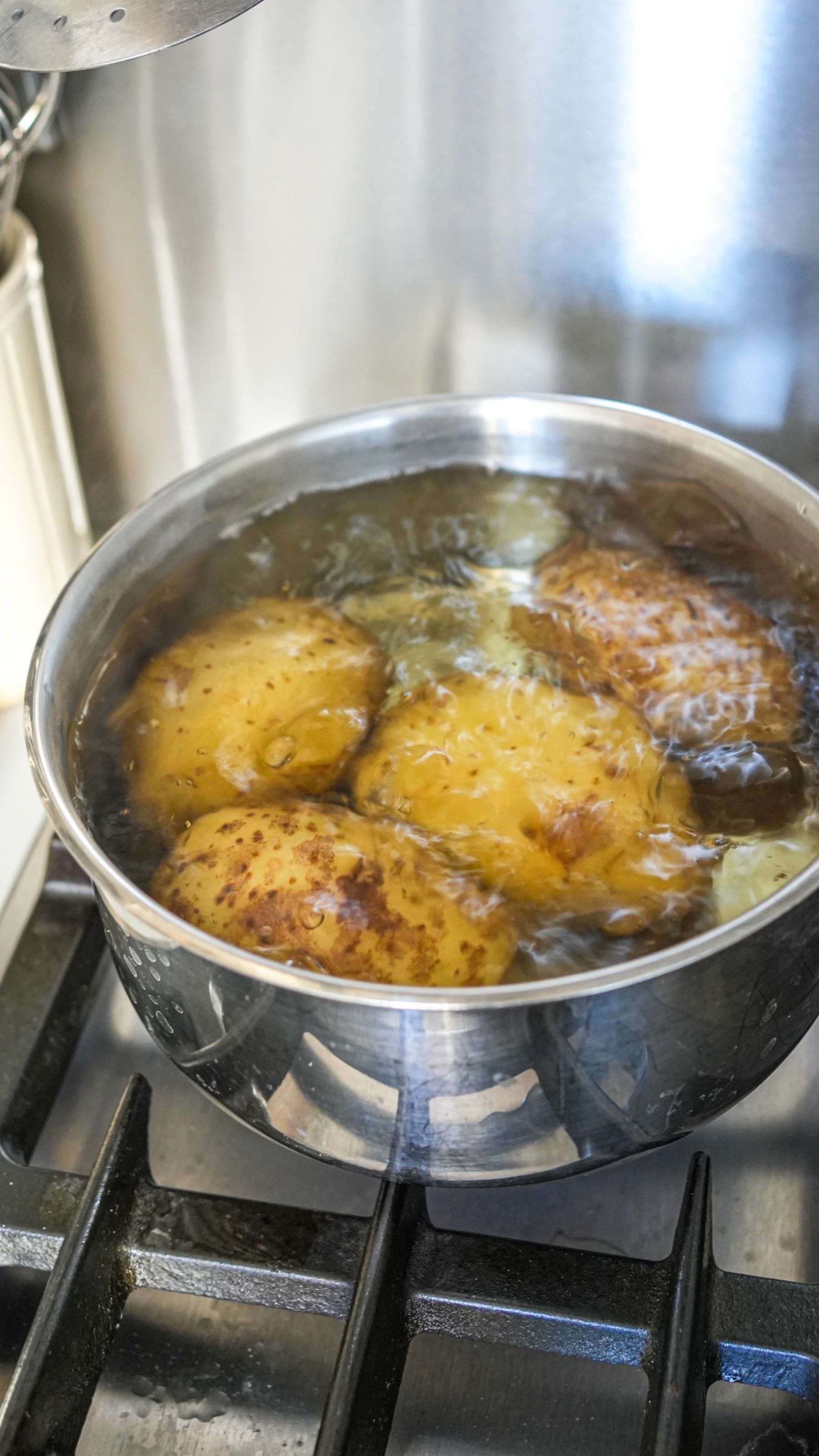 Place the potatoes in a large saucepan and cover with cold salted water. Bring to the boil, then reduce to a gentle simmer. Cover and cook for 30-40 minutes, until tender when pierced with a knife.