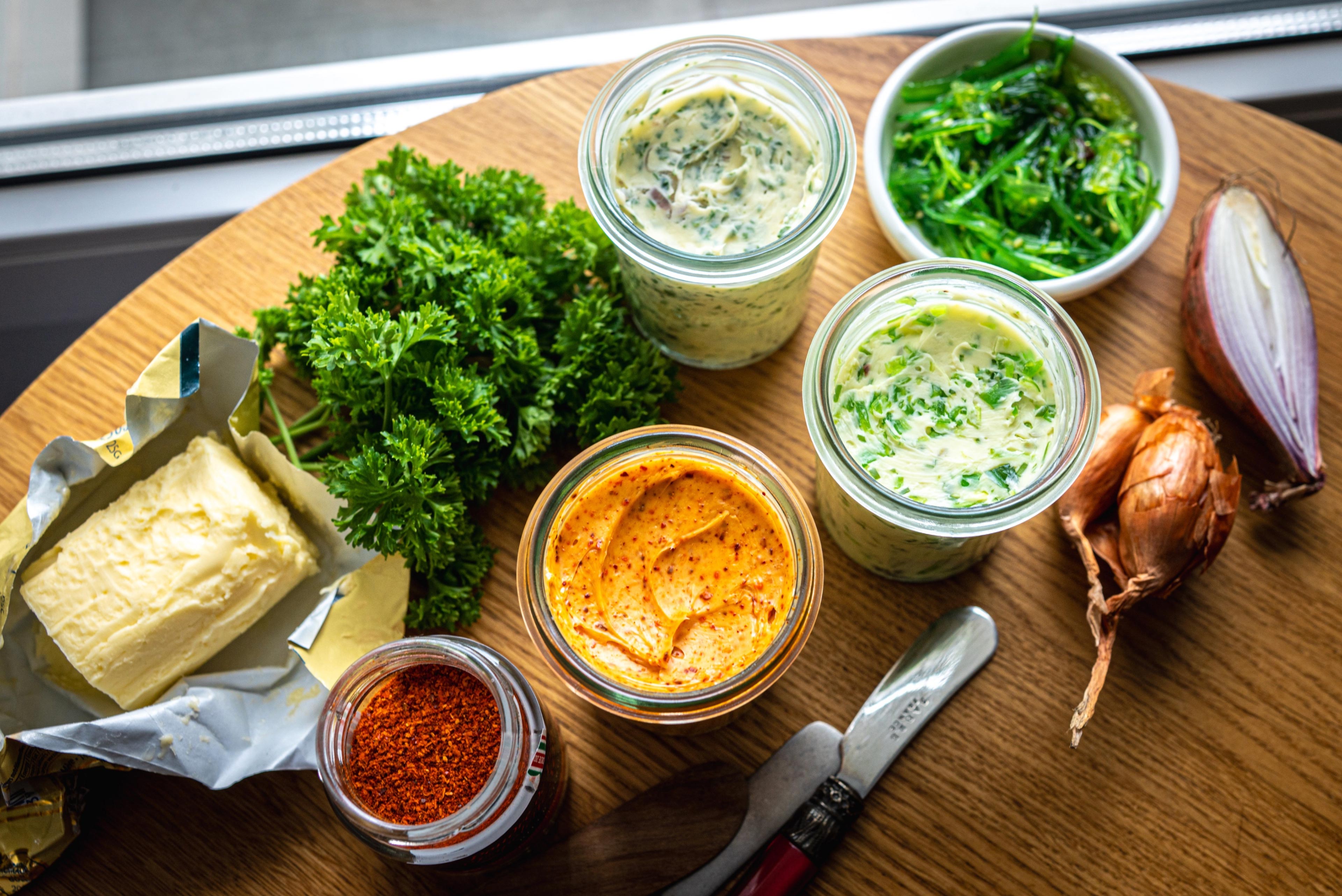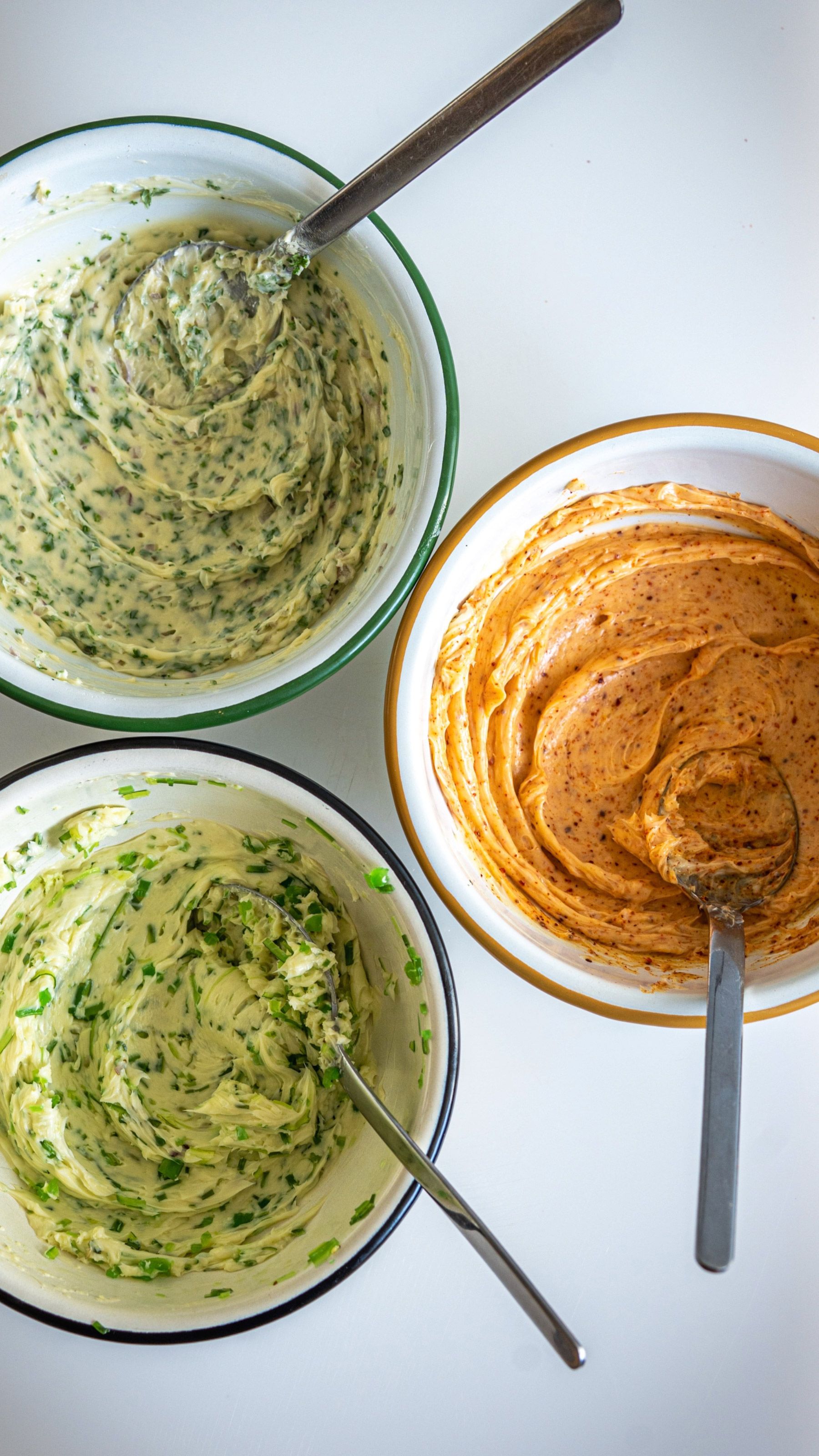 Shape each flavored butter into logs using cling film, or spoon into small ramekins. Refrigerate until firm and ready to serve.